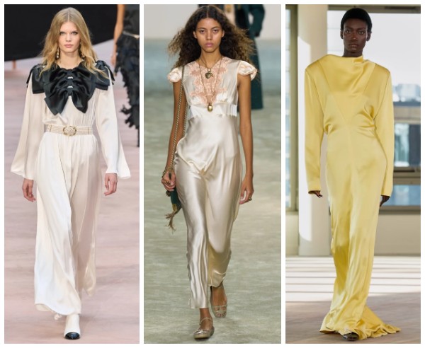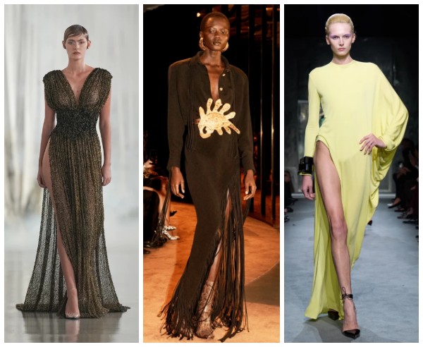 Чтобы придать образу элегантности, грациозности и сексуальности рекомендуем выбирать платья с откровенными разрезами, которых в новых коллекциях предостаточно. На коллаже представлены платья из коллекций LEVER COUTURE, Schiaparelli и Tom Ford.