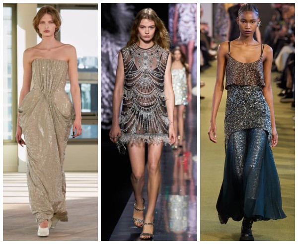 Как уже говорилось выше, чтобы угодить Красной Огненной Лошади можно в качестве новогоднего образа подобрать элегантное вечернее платье с блестками или блузку (если планируете составлять образ с юбкой или брюками). Блестки всегда будут актуальны в новогодних образах, к тому же они могут создать эффект огненных искр, что будет отсылкой к Покровительнице 2026 года. Прекрасные варианты предлагают Alexander McQueen, Dolce&Gabbana, Stella McCartney, Rabanne и др.