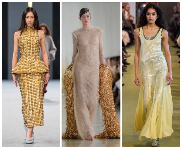 Как уже говорилось выше, не стоит забывать про золото в своих образах. Как видим на моделях с последних показов, оттенки золота могут быть самыми разными, что позволит вам регулировать «градус» экстравагантности. Мы черпали свое вдохновение у Balmain, LEVER COUTURE и Rabanne.